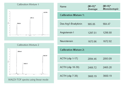 This kit consists of two calibration mixtures for calibrating mass scale in MALDI-TOF or ESI mass spectrometry. Calibration Mixture 1 ranges from 800 to 1800 daltons, and Calibration Mixture 2 from 1800 to 3800 daltons.