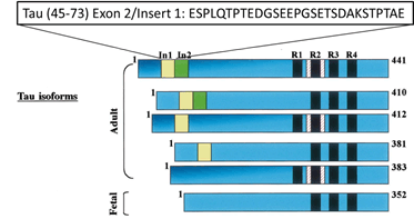 TAU proteins belong to the microtubule-associated protein (MAP) family and are involved in the pathogenesis of Alzheimer’s disease. In the human brain, there are six TAU isoforms ranging from 352 to 441 amino acids in length. These isoforms vary at the carboxyl terminal according to the presence of either three repeat or four repeat domains (R1-R4), in addition to the presence or absence of one or two insert domains at the amino-terminus (see figure below). Tau Peptide (45-73) is a 29-amino acid long peptide derived from the Exon 2/Insert 1 domain.