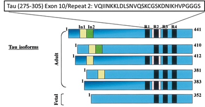 TAU proteins belong to the microtubule-associated protein (MAP) family and are involved in the pathogenesis of Alzheimer’s disease. In the human brain, there are six TAU isoforms ranging from 352 to 441 amino acids in length. These isoforms vary at the carboxyl terminal according to the presence of either three repeat or four repeat domains (R1-R4), in addition to the presence or absence of one or two insert domains at the amino-terminus (see figure below). Tau Peptide (275-305) is a 31-amino acid long peptide derived from the Repeat 2 domain.
