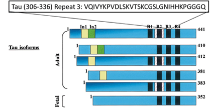 TAU proteins belong to the microtubule-associated protein (MAP) family and are involved in the pathogenesis of Alzheimer’s disease. In the human brain, there are six TAU isoforms ranging from 352 to 441 amino acids in length. These isoforms vary at the carboxyl terminal according to the presence of either three repeat or four repeat domains (R1-R4), in addition to the presence or absence of one or two insert domains at the amino-terminus (see figure below). Tau Peptide (306-336) is a 31-amino acid long peptide derived from the Repeat 3 domain.