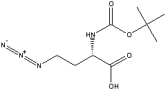 An unusual amino acid used in Solid Phase Peptide Synthesis (SPPS) for the synthesis of modifiable side-chain peptides and proteins.1 The side-chain azido (N3) group is stable in trifluoroacetic acid (TFA) and piperidine (Pip), two reagents commonly used in SPPS. The azido group can be readily converted to an amine on the solid phase or in solution via the Staudinger reduction.2 In addition, incorporation of azidohomoalanine into proteins has shown promise as an effective IR probe into local electrostatic environments of proteins.3