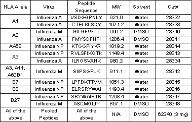 These 12 Influenza virus peptides, at 0.25 mg each (total of 3 mg/vial), constitute part of the CEF Control Peptide Pool (cat# 61036-025). Now available separately as Influenza Control Peptide Pool, EBV Control Peptide Pool (cat# 62341) and CMV Control Peptide Pool (cat# 62339), these peptides have been used in the stimulation of IFNγ release from CD8+ T cells in individuals with defined HLA types, these epitopes are useful in applications such as ELISPOT, intracellular cytokine and CTL assays. All peptides are provided as net weight based on peptide content.